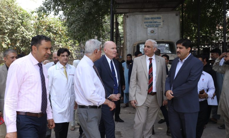 لاہور: پاکستان میں آسٹریلیا کے ہائی کمشنر مسٹر ٹموتھی کین نے کالج آف آپتھلمولوجی اینڈ الائیڈ ویژن سائنسز (COAVS)، کنگ ایڈورڈ میڈیکل یونیورسٹی/میو ہسپتال لاہور کا دورہ کیا۔ اس دورے کا مقصد آنکھوں کی صحت کے شعبے میں آسٹریلیا کے دیرینہ تعاون کے اثرات کا خود مشاہدہ کرنا تھا۔ انہوں نے یونیورسٹی اور میو ہسپتال میں آسٹریلوی تعاون سے چلنے والی طبی، تدریسی اور تربیتی سہولیات کا معائنہ بھی کیا۔